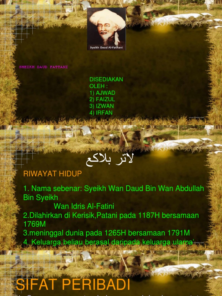 Syeikh daud al fatani diilhamkan bahawa di bawah busut itu terdapat sejongkong emas. 255 likes · 1 talking about this. Thus, the price must be informed, whether the principal price at the time of. Beliau dilahirkan di kampung parit marhum, kerisek, patani. He was known as a productive scholar and prolifi c book, which can be viewed from various aspects.
